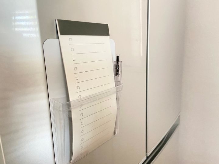 冷蔵庫の扉にはキャンドゥのマグネットポケットに無印の短冊型メモ チェックリストとペンを収納しています。