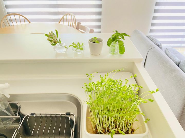 今回最初に試してみたのは、豆苗とミントとバジル。食器棚の中にあるものを使って、水につけておくだけなので、とっても手軽に始められるのがメリットです。水だけで家で行うので、虫が湧いたりということもありません。