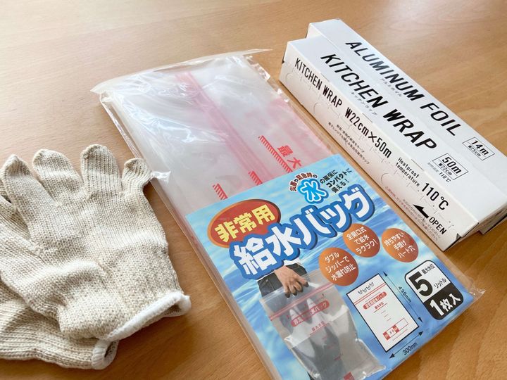 キッチンストックとしても持っておくと便利なのがラップとアルミホイル。非常用の給水バッグも1人1つあると便利です。軍手はグレーやホワイトなどシンプルなものが多いのが嬉しいところ。キッズ用もあるのでチェックしてみて下さい。