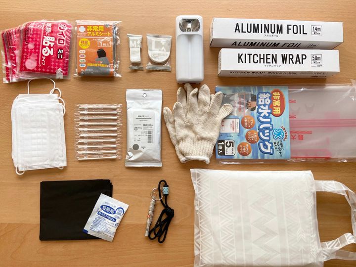 まず最初にオススメしたいのが、ダイソーの非常用袋。入れ物を買うと人はその中に詰めたくなるもの!こちらを買って中身を揃えていきましょう。雨ガッパはダイソーが種類が豊富で、可愛いものが多いのでオススメ。圧縮タオルも持っておくと便利です。