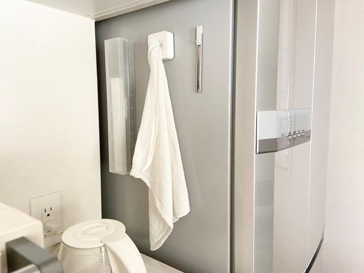 使用頻度の高いものは出しっぱなし収納が便利ですが、出しておく場所がポイントに。プリントを貼っておきたいのであれば、冷蔵庫の正面でなく横側、小物や調理ツールもカウンターの端の隅、布巾類も極力死角となる位置に。あくまでも使いやすい位置に設置するのが大切ですが、人から見えづらい位置を意識するとキッチンがスッキリ整います。