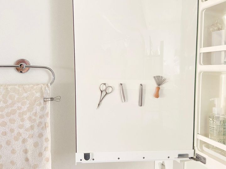 ハサミやカッター、印鑑などよく使う小物類にオススメなのが浮かす収納!マグネット対応のものではない場合で、浮かしたいモノが金属の場合は、浮かしたい場所にマステを貼って超l強力マグネットを貼っておく、浮かしたいモノが金属ではない場合は、浮かしたいモノ本体に超強力マグネットをマステで貼り付けると簡単に浮かせることができます。