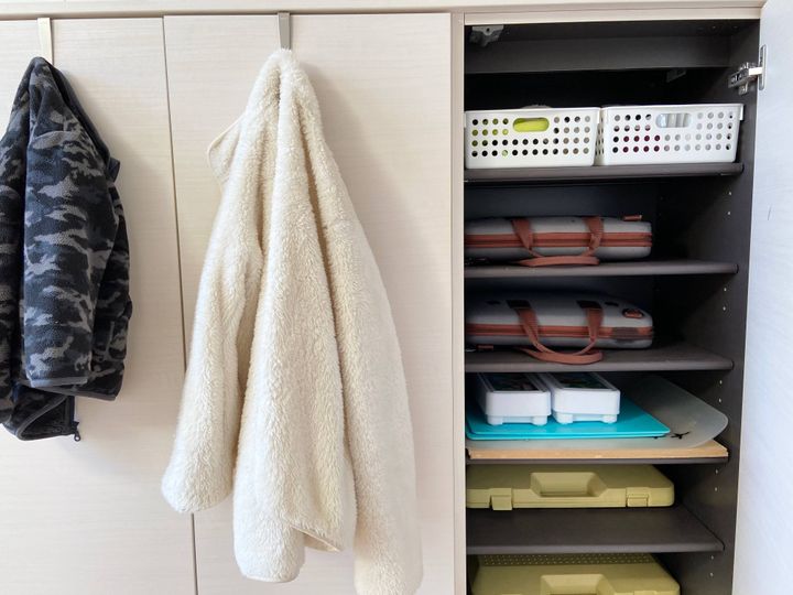 外出する時に忘れると困るものは定位置化しています。我が家の場合は、鍵、マスク、携帯、子供達の上着は出かけに忘れた〜とならないように、玄関の見える場所に定位置を設けています。また、玄関は子供にとって一番導線の短い場所。持って行く時も持って帰ってくる時も楽ちんなように、ピアニカや習字セット、マフラーや手袋などの小物も靴箱に定位置を作っています。