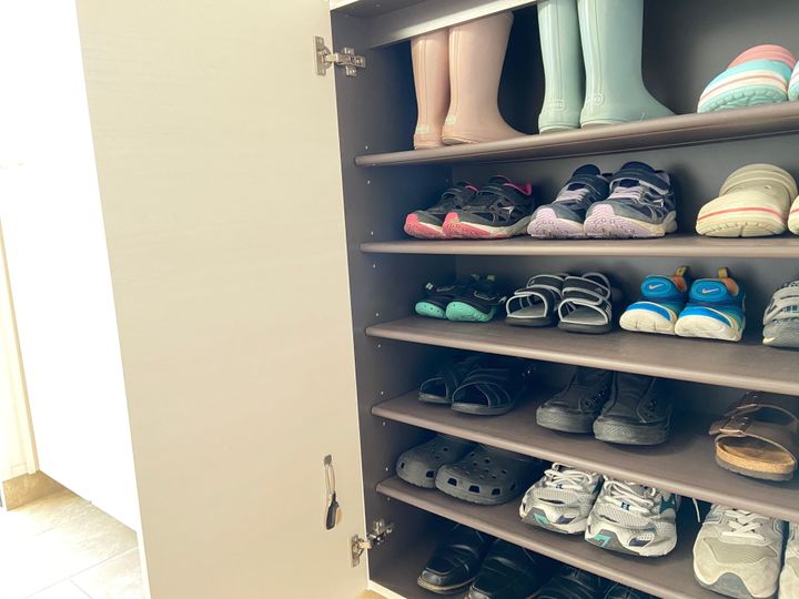 普段用に使う靴は1人3〜5足、家族分取り出しやすい下段の靴箱に収まる数に絞ります。定期的に見直してサイズアウトしている靴や履いていない靴は取り除き、新しい靴を1足迎える時は1足手放すことにしています。