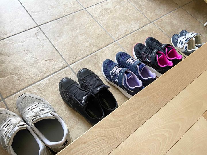 玄関のたたきに置いておく靴は1人1足までに絞ります。毎回靴箱に戻すのが理想ですが、翌日また使う靴を仕舞うのは面倒に感じるもの。出しっぱなしにしても良い靴は1人1足までというルールにしています。