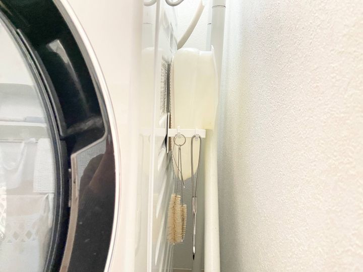 置き場所に困るバスブーツを収納するのに使っているのがバスブーツホルダー。強力なマグネットなので横・下ずれするようなこともなく、洗濯機の隙間を有効活用できるアイテム。フックも3つ付いているので洗面所とお風呂の両方で使うブラシを2種引っ掛け収納しています。