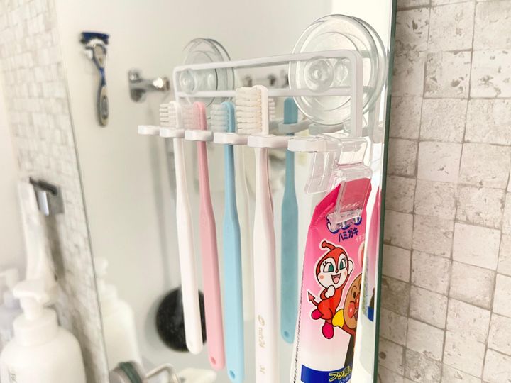 洗面所とお風呂場の2箇所で使っているのが歯ブラシホルダー。マグネットタイプと吸盤フックタイプの2種類がありますが、我が家では吸盤フックタイプを活用中。歯ブラシ5本をコンパクトに並べて収納できるということで、5人家族の我が家にぴったりなのです。最初に少し濡らして吸着させれば、吸盤もずれたり落ちたりすることもないのでノンストレスです。