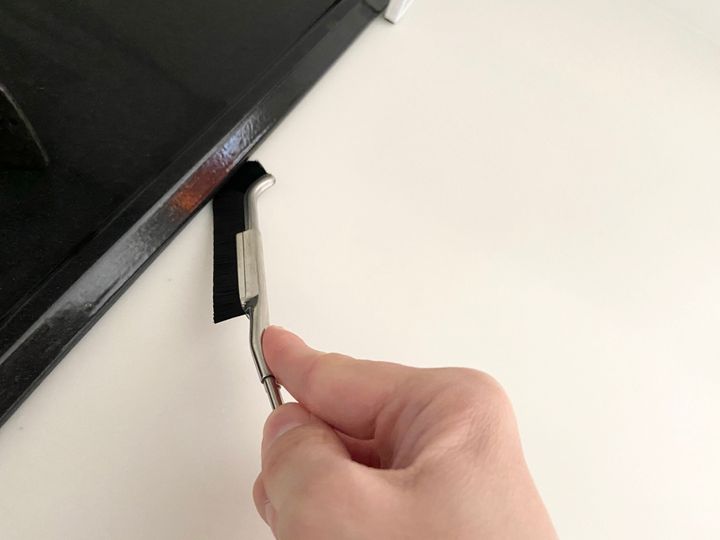 コンロ周りの隙間掃除には専用ブラシがオススメ。以前隙間ガードや汚れ防止テープを使って予防掃除をしていたことがあるのですが、ガード下に液だれが付着して余計に汚れが取りにくかったり、テープの貼り替えが面倒で怠ったりと自分には向いていなかったので今は止めてしまいました。普通に拭きあげても取れない汚れは気になる時に専用掃除ブラシでサクッと汚れをかき出してしまうことにしています。
