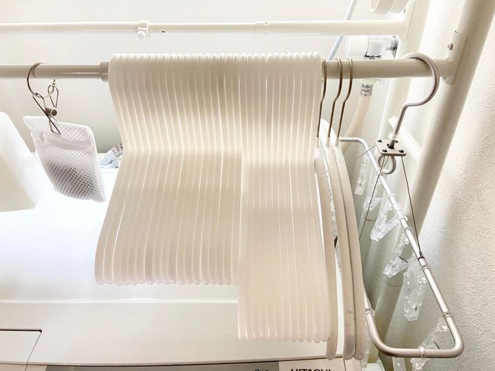以前はハンガーは1階の廊下収納の中だったのですが、平日は部屋干し、梅雨時期など乾きが悪い時期はお風呂場で浴室乾燥、土日の天気の良い日は外干しをしており微妙に干している場所が違うので、動線を最短にさせるため洗濯機上に集結させました。