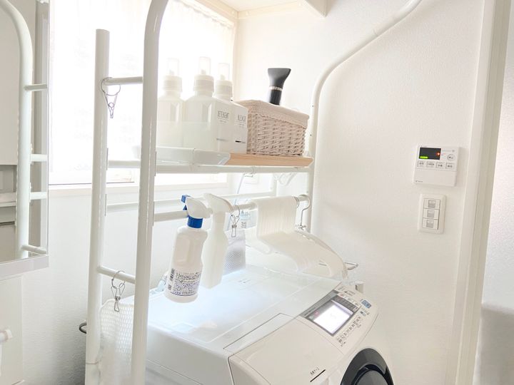 洗濯で使うグッズやデイリーの掃除で使うものは全てこの洗濯機周りに集結させています。使っているのはもう8年となるnastaのランドリーラック!(スウェーデン語で「明日」という意味のnasta。人生のちょっとしたことでも楽しくという思いから誕生したランドリーブランドです!)