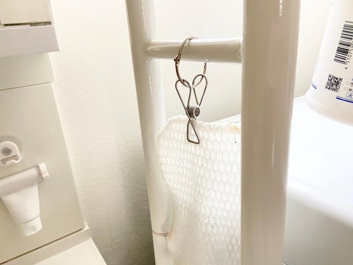 毎朝洗顔のついでに行う洗面シンクの掃除用のアミタワシも、ラックに吊るし収納しています。毎日使うものは、使う場所から最短の位置にセットを目指しています。