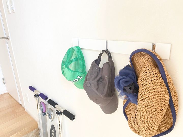 扉の中にしまうのが面倒かつ持って行くのを忘れたくないので玄関に置いておきたいものは、玄関に定位置を作ってしまいます。我が家の場合は、全員分の帽子を玄関フックにかけて1アクションで取り出せるように収納しています。また、保育園に持って行く荷物もエコバッグに入れて靴箱扉にフックをつけて収納しています。