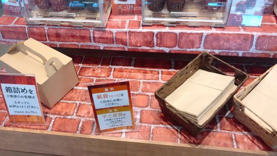ショーケースの前に紙袋(サイズは小・大)が置いてあります。