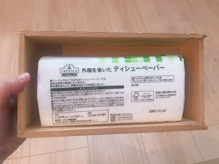 トップバリュの人気商品、外箱を省いたティシューペーパー。