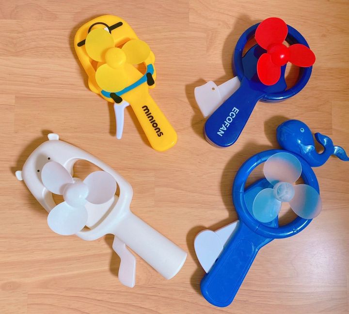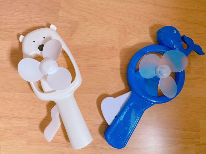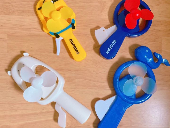 そこで今回はわが家の2歳と3歳の子ども用に、ダイソーとセリアの手動式ハンディファン(レバーを押すだけで使えるもの)を2つずつ購入。