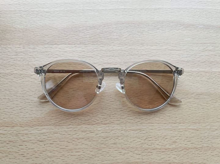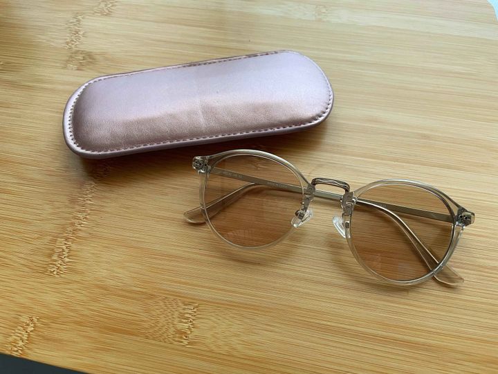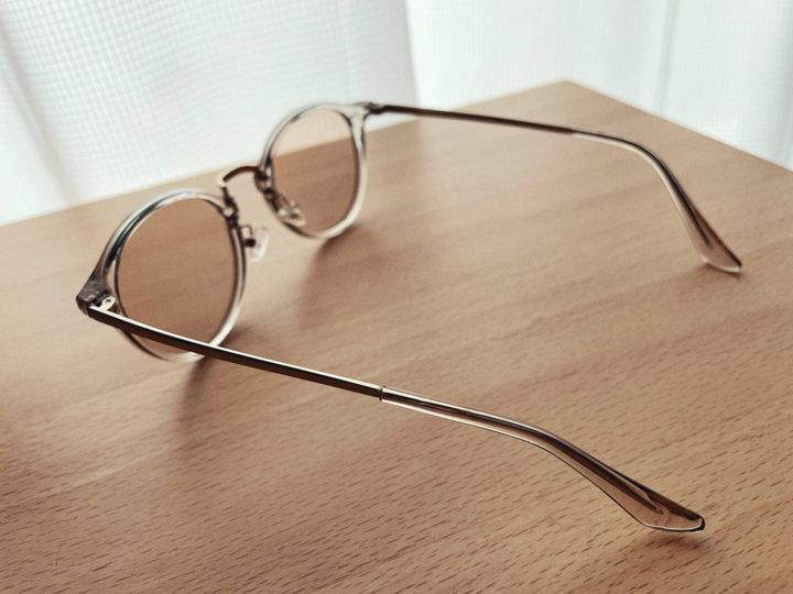 私が選んだブラウンはクリアフレームとピンクブラウンのレンズが可愛らしいデザインですが、ツルやブリッジ(鼻掛け)にツヤ感があるおかげか、かけてみると意外と上品な雰囲気に。