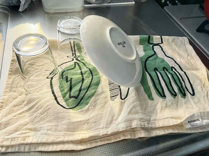 洗った食器はクロスの上に起き、すぐにフキンで拭き取り。