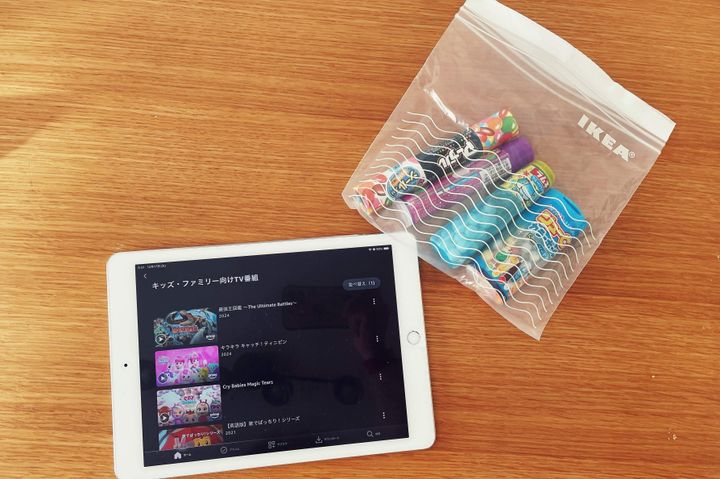 これまで絵本にシール帳、小さなおもちゃにぬいぐるみ…と、数々のグッズを試した結果、もっとも効果的だったのが「タブレット」と「お菓子」。