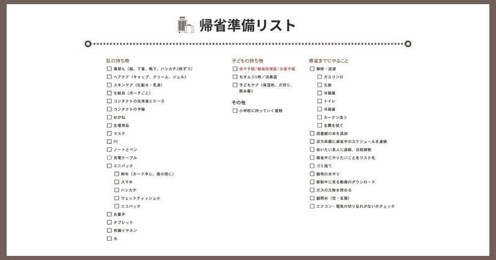 以下に我が家の帰省準備リストも掲載しているので、参考にしてみてくださいね。