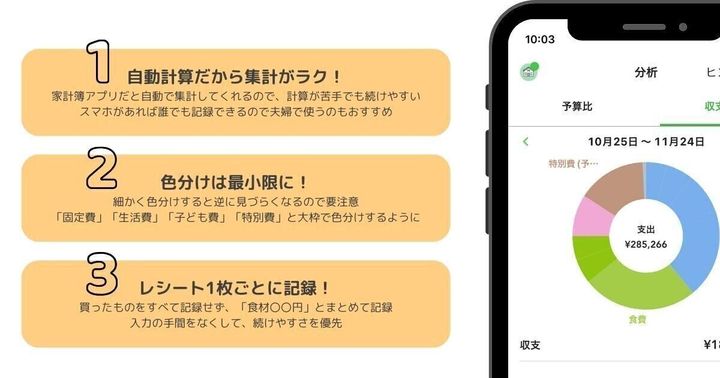 忙しいママにおすすめなのが、家計簿アプリ。スマホがあればいつでもどこでも記録や見直しができ、自動で計算もしてくれるので、忙しい毎日でも無理なく続けられますよ。