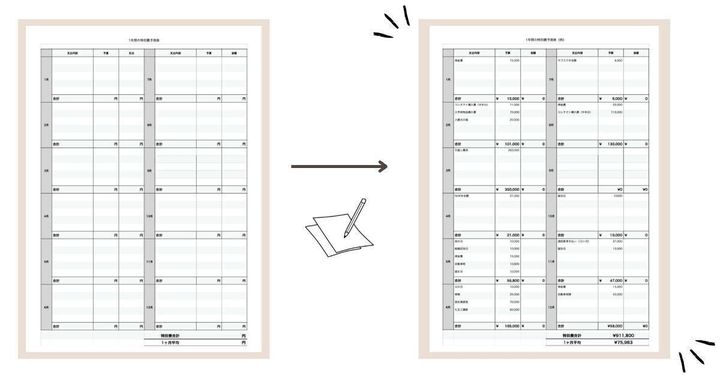 わたしは計算が苦手なので表計算ソフトを使っていますが、ノートに手書きでもOK!自分がやりやすい方法で試してみてくださいね。