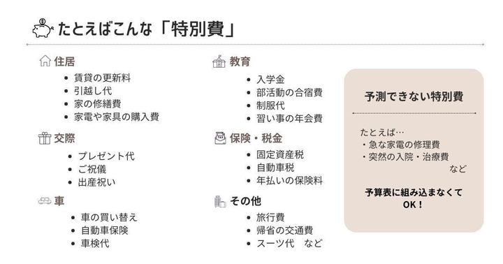 特別費とは、1年のうちのどこかで支払うことが予想される支出のこと。たとえば固定資産税などの税金、サブスクリプションの年会費、帰省や旅行の費用、子どもの入学金や部活の合宿費用などが、特別費にあたります。