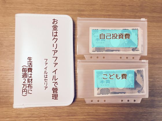 「自己投資費」と「こども費」は1ヶ月単位で管理し、クリアファイルの中でやりくり。