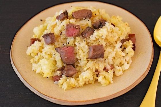 にんにくと炒めたご飯に、バター醤油で味付けするだけで完成します。