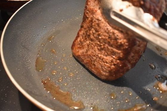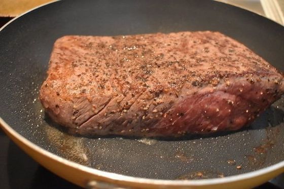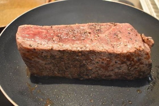 そこに下準備したローストビーフ用の肉を入れ、各面1分程度ずつ目安に焼きつけます。