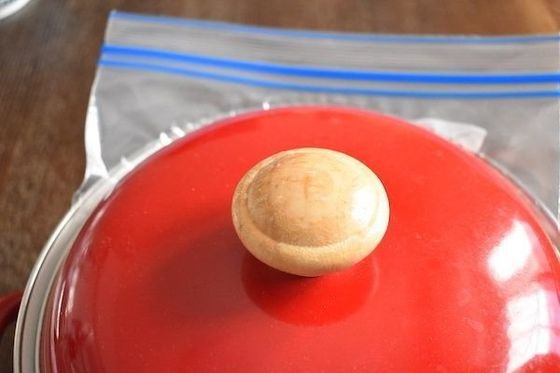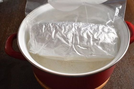 袋の端を鍋とフタで挟めば、水没は防げます!
