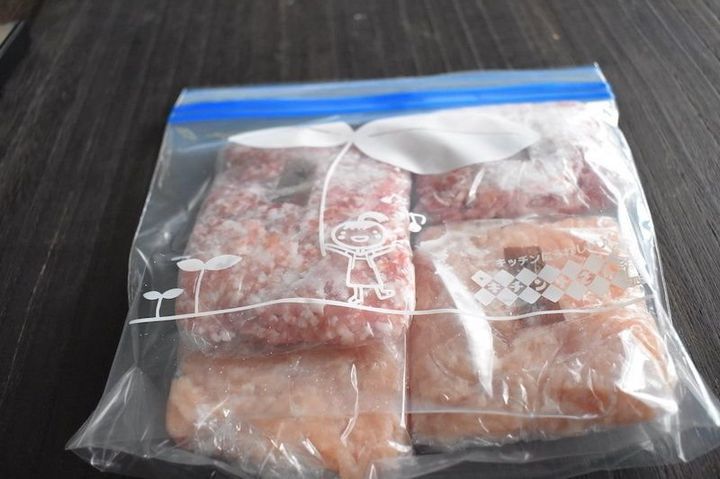 よく使う分量を小分けにしラップで密閉し保存袋に入れて冷凍をします。注意すべき点は、小分けにした肉類は冷凍すると何の肉だったか.....選別が難しいので、肉の名称を書いておくことをおすすめします。