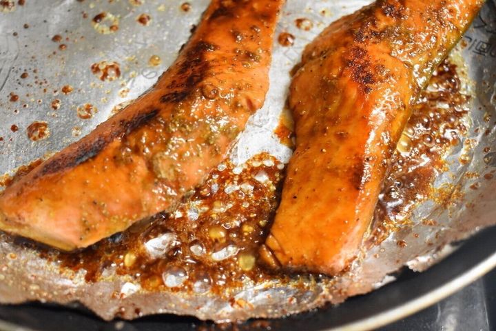 鮭にタレをからめますが、動かすのは最小限にすることで香ばしい焼き色がつきます。ただし焦げないように見張ってください!タレに濃度がつきトロッとなったらすぐに火を止め、ホイルで包む(またはフタをして)2分ほど蒸らし完成です。