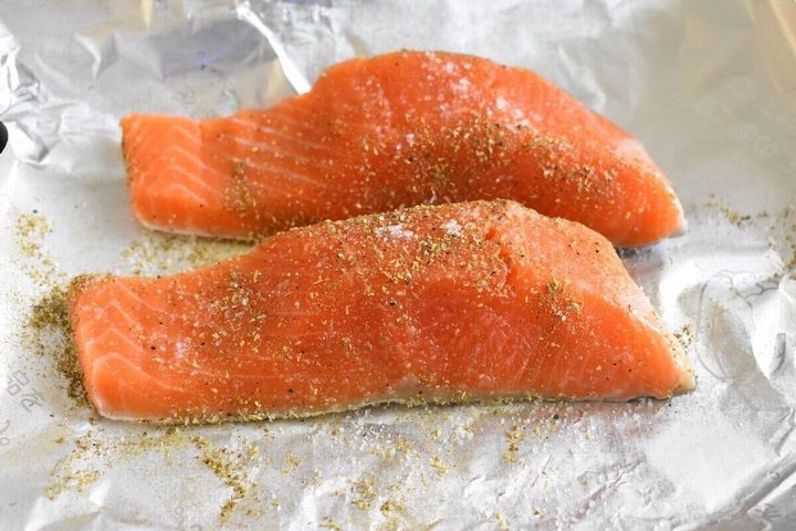 鮭(裏表)に塩、粉山椒をふります。今回はタレを使うので、塩は指先にちょっとつまんでパラパラっとふりかける程度でOK!粉山椒は全体に均等にしっかりふりかけてください。