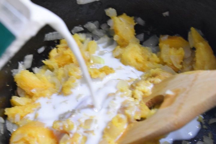 たまねぎに火が入り透き通ってきたら、焼き芋を加えて潰す。