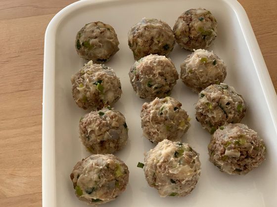6.5の粗熱を取り、好みの大きさに丸め、薄力粉→卵→パン粉の順に衣をつける