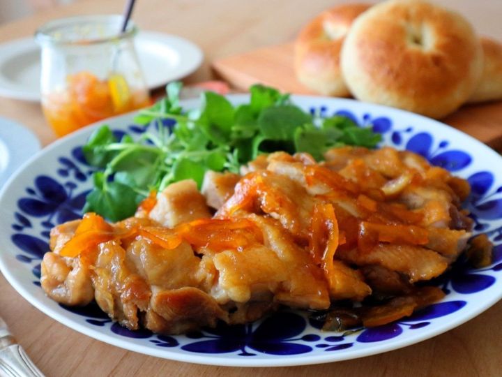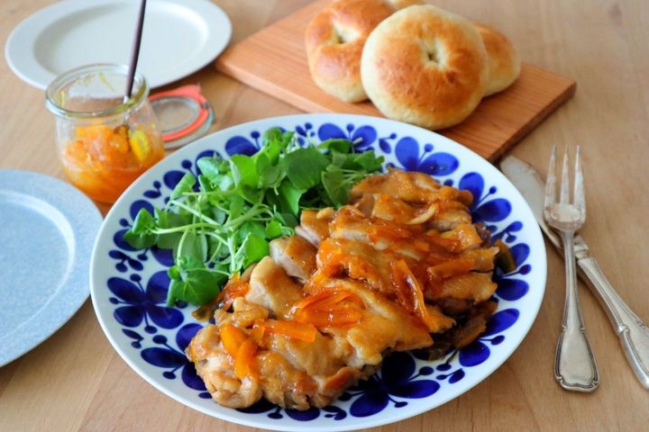 鶏肉のマーマレード煮は、ご飯にも、パンにも合います。私のおすすめの食べ方は、カンパーニュなどのハード系のスライスに大葉とのせて食べることです。ぜひお試しください。