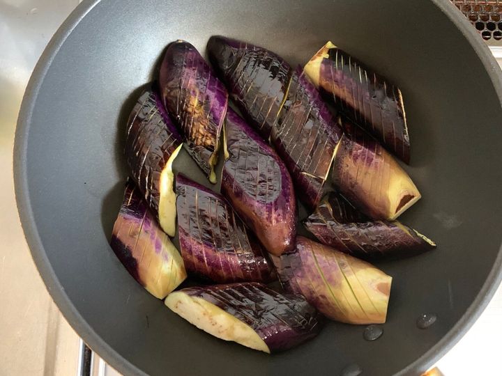 3. フライパンに大さじ1の油を入れ熱し、茄子を皮が下になるように並べる