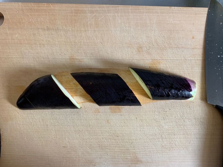 2. 切れないよう斜めに切込みをたくさん入れ、3等分くらいに切る