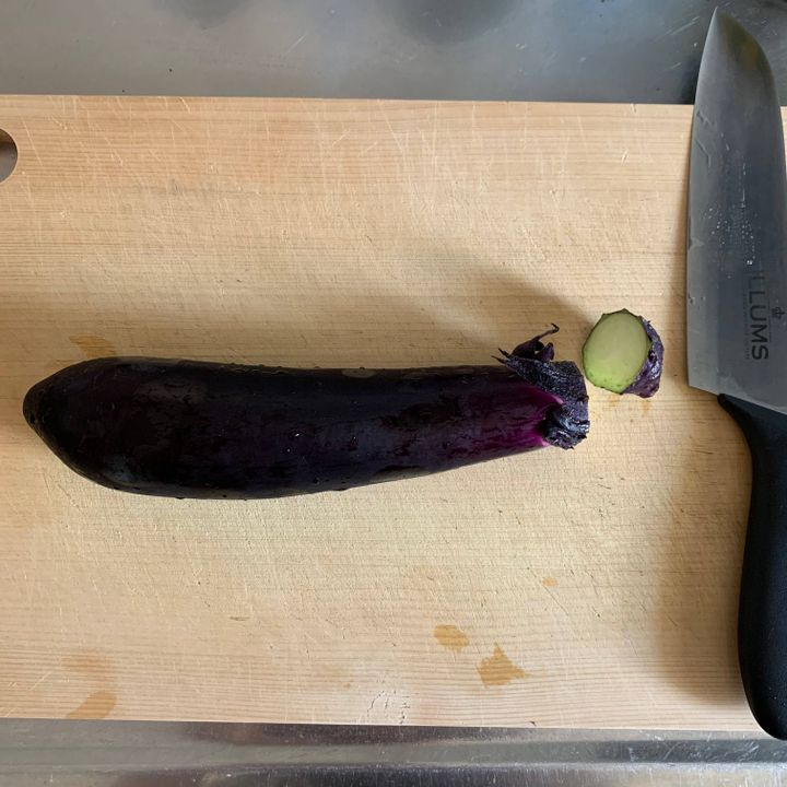 1. なすのヘタ先端ギリギリに切り落とし、ヘタを取り、縦半分に切る