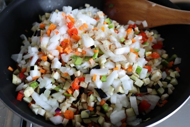 1.玉ねぎ、人参、茄子、パプリカ、ピーマンを5㎜角くらいのみじん切りにする