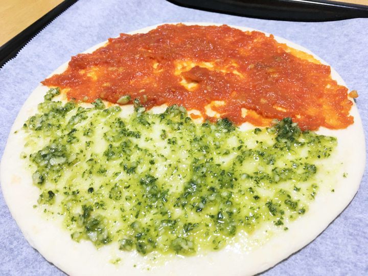 先日、手作りのジェノベーゼソースを作ったので、それを活用してピザを作ってみました!