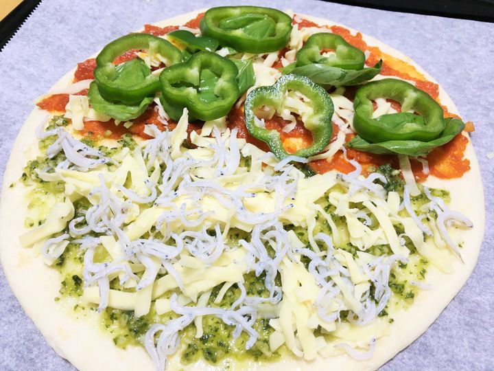 全体にチーズをのせ、ジェノベーゼの方はしらすを、トマトソースの方はピーマンとバジルをトッピング。
