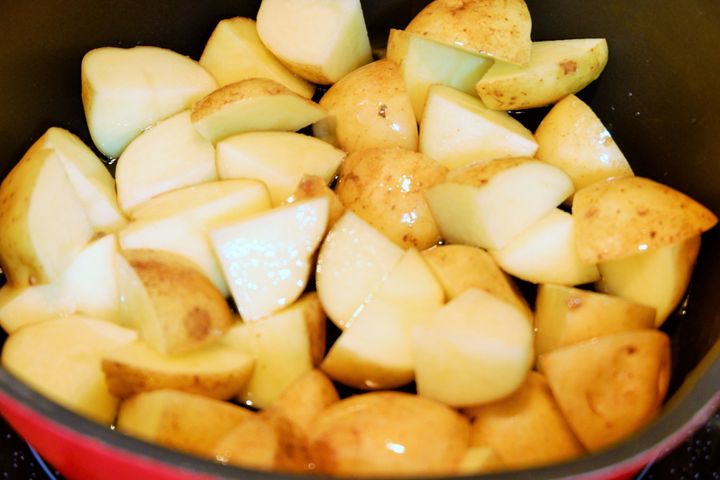 1.新じゃがはよく洗い、皮付きのまま食べやすい大きさに切り、鍋に入れる。油を1cmほど注ぎ、火を付け中火で加熱する。