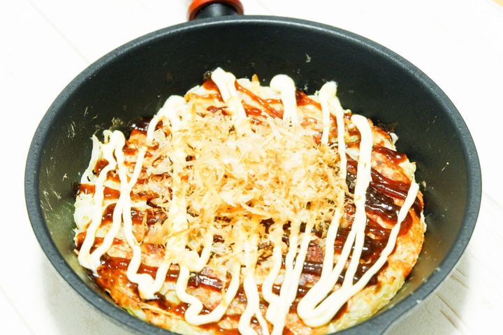 5.もう片面も焼いたら、火を止めお好み焼きソース、マヨネーズ、青のり、鰹節などをかけて完成〜!