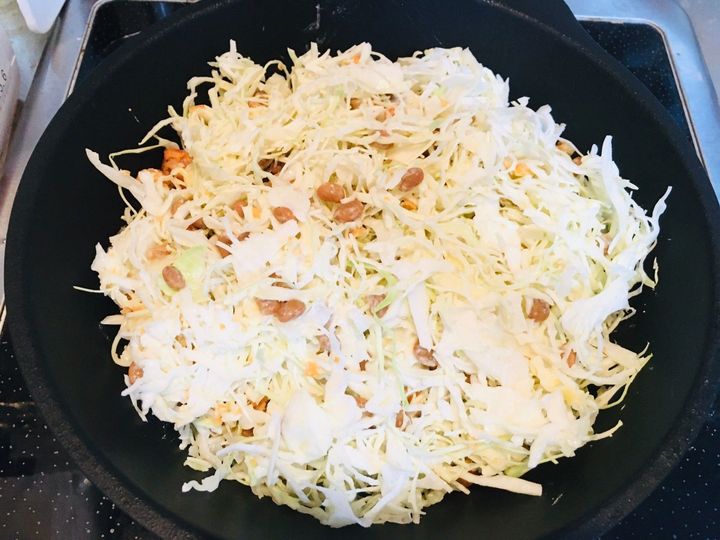 2.キャベツを入れ1とさっくり混ぜる。軽くかき混ぜた納豆、付属のたれ、砕いたイカフライスナックを入れて混ぜる。