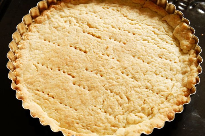 麺棒でタルト型の大きさにのばし、生地を型に入れ、フォークで穴を開けたら冷蔵庫で15分冷やす。
