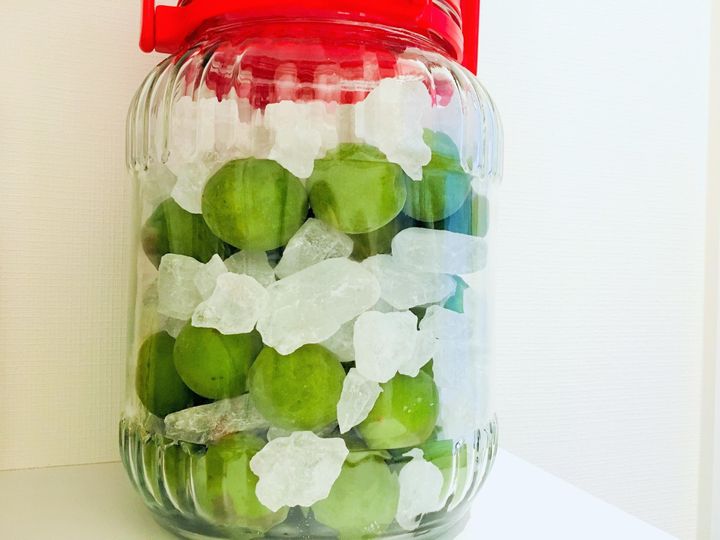 3.熱湯消毒し、よく乾かしたびんに梅と氷砂糖を交互に入れ、日光の当たらない涼しい場所で氷砂糖が溶けるまで待ちます。