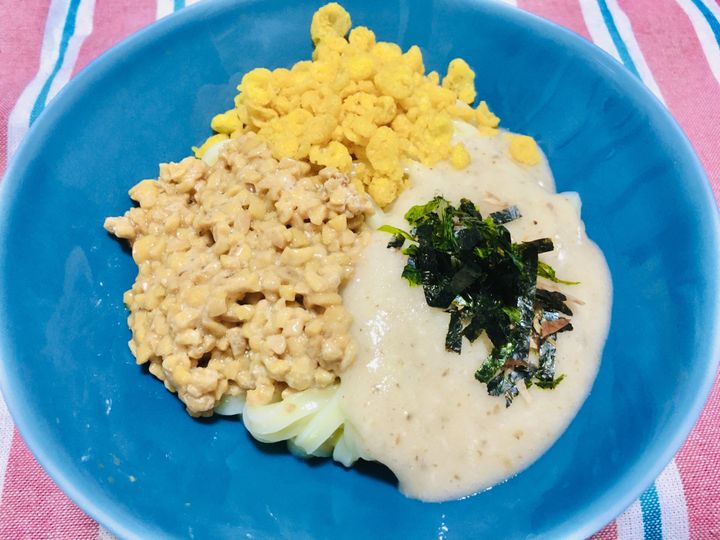 うどんの場合、これまたセブンの冷凍うどんをレンチンして、納豆、とろろ、揚げ玉を乗せたものが大好き!