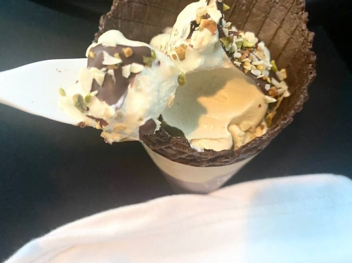 ローストピスタチオとアーモンドがたっぷりトッピングされています。小さくクラッシュされているので、食べやすくてなめらかなソフトクリームにマッチしています!