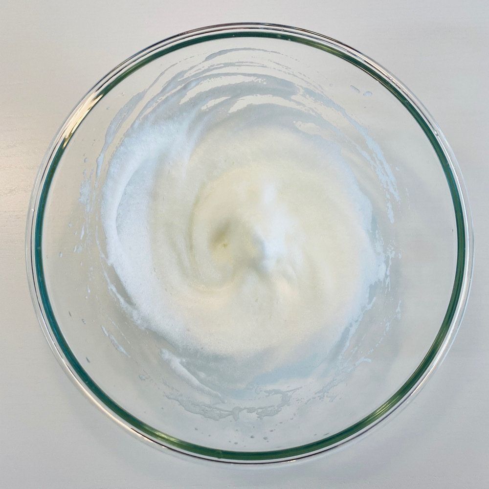 卵白を泡立てるとき、ハンドミキサーを使うとすぐできますが、卵1個分なら普通のホイッパーで5分くらいで出来ます。